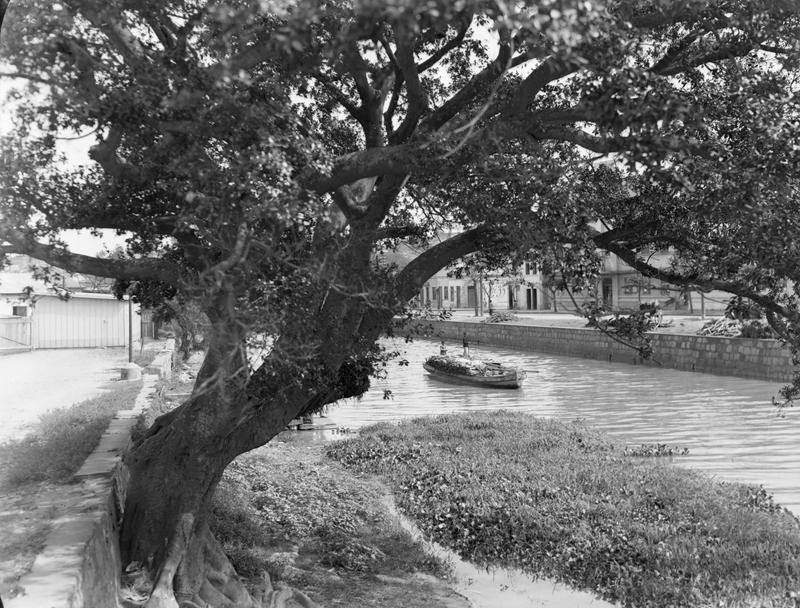 Uma composição muito bonita do Arroio Dilúvio antes de ter seu curso natural desviado e canalizado. Nesse período o arroio servia de abastecimento de água, descarte de esgoto e lixo, agricultura e criação de animais, lazer e recreação e o transporte e travessia como podemos ver na fotografia que mostra barqueiros transportando lenha.